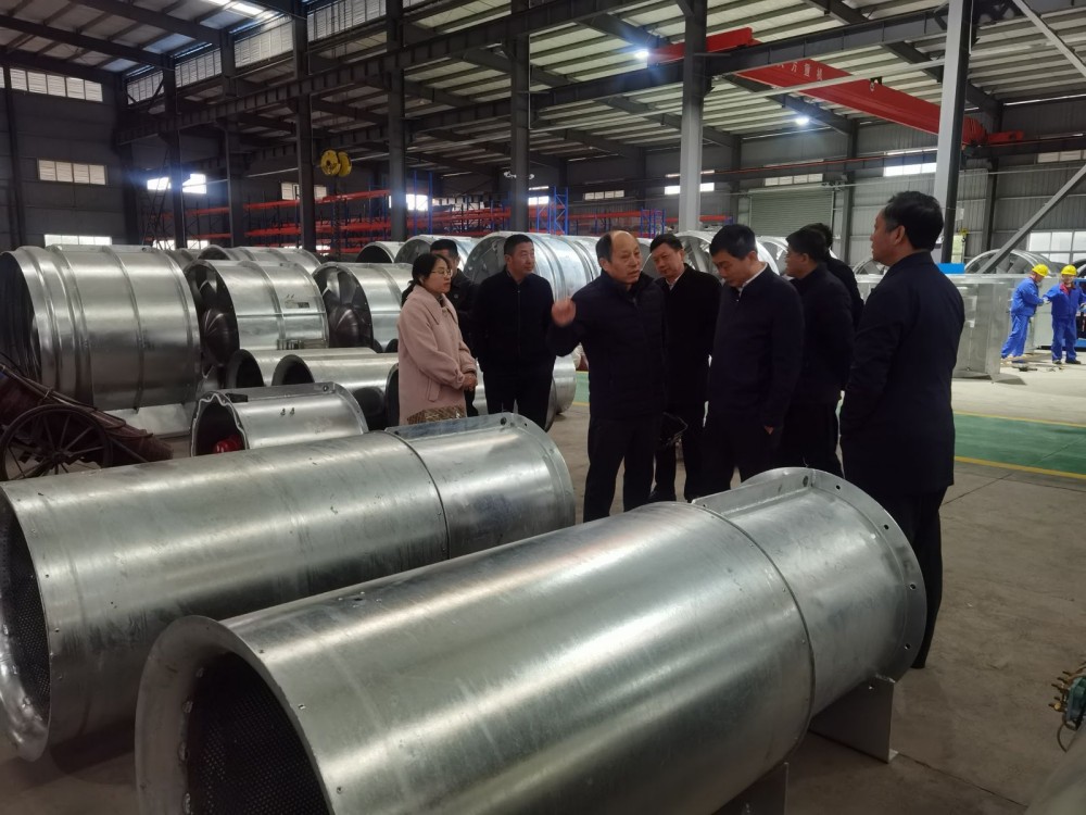 公司總裁劉書鵬(左二)向省經(jīng)信廳副廳長(zhǎng)郭濤(左三)介紹地鐵風(fēng)機(jī)